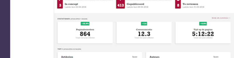 Within the author environment we show a top 5 of both best scoring authors and articles. By providing this insight we stimulate internal competition which results in more quality articles.