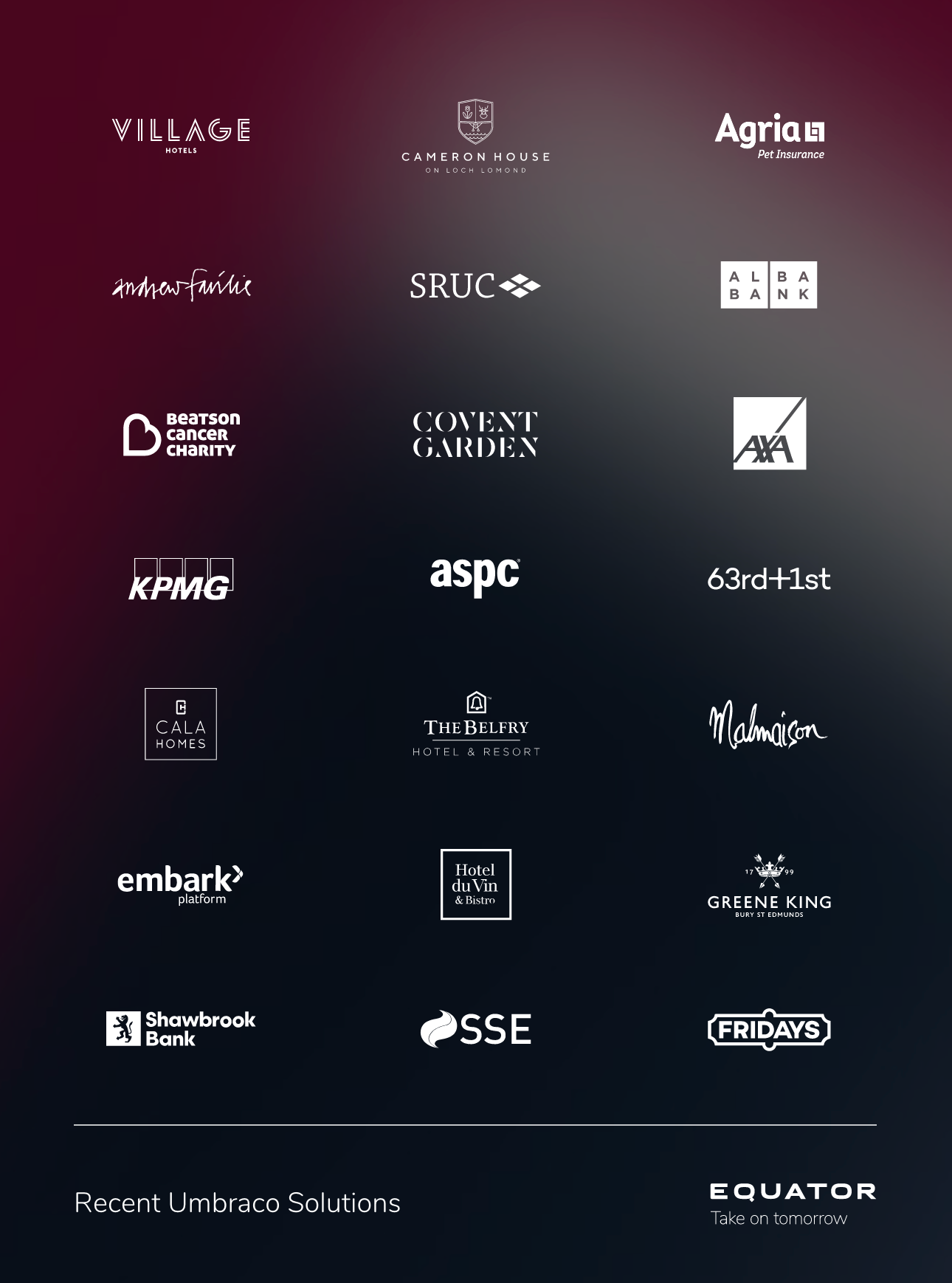 Umbraco plays a central role in many projects we’ve created to transform our clients’ customer experiences. Since 2008, we have launched over 350 experiences, including brands such as Malmaison, Village, SSE and AXA, to name a few. Our standards back the quality of our engineering - ISO 9001, 27001 and PCI certified.